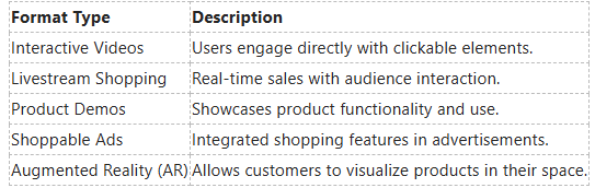 Ce format va au-delà du marketing vidéo traditionnel en offrant une expérience interactive. Par exemple, un détaillant de mode pourrait présenter une collection de vêtements dans une vidéo de type lookbook, où les spectateurs peuvent cliquer sur les tenues présentées et être redirigés directement vers la page d'achat, simplifiant ainsi le processus d'achat.