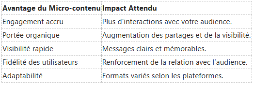 Le micro-contenu présente l'avantage d'être rapide à consommer, ce qui est crucial dans un monde où l'attention des utilisateurs est limitée. Il augmente également l'engagement immédiat en jouant sur la curiosité et la facilité d'accès. Cependant, sa brièveté peut parfois nuire à la profondeur d'information, limitant les détails que vous pouvez fournir.