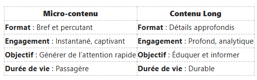 Faire coexister micro-contenu et contenu long peut être une stratégie puissante pour maximiser l'impact de vos efforts marketing. Par exemple, vous pouvez créer des publications courtes qui résument des articles de fond ou des études de cas, attirant ainsi l'attention sur votre contenu plus long. Cette approche attire un public diversifié, tout en permettant à ceux qui souhaitent approfondir leurs connaissances d'accéder à des ressources plus complettes.