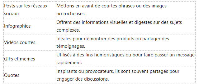 Il existe plusieurs types de micro-contenus que vous pouvez utiliser pour diversifier votre approche marketing. Ces formats incluent :