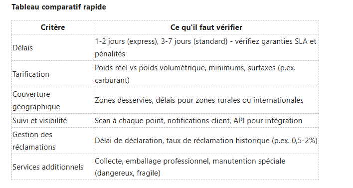 Vous devez évaluer simultanément plusieurs critères : délais de livraison (1-2 jours pour express, 3-7 jours pour standard) , couverture géographique, prise en charge des dimensions lourdes et les options de suivi en temps réel. Par exemple, un transporteur express national prendra en charge des colis jusqu'à 30 kg avec suivi 24h/24 et 7j/7, tandis qu'un transporteur régional peut offrir des tarifs inférieurs mais des délais variables et moins d'options de réacheminement.