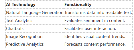 Plusieurs technologies d'IA jouent un rôle essentiel dans la création de contenu, chacune répondant à un besoin spécifique. Par exemple, la génération automatique de langage naturel (GAL) transforme les données structurées en texte cohérent, tandis que les outils d'analyse textuelle évaluent le sentiment véhiculé par les mots. D'autres technologies, telles que les chatbots et la reconnaissance d'images , améliorent l'interaction utilisateur, garantissant une expérience plus dynamique sur toutes les plateformes. sur toutes les plateformes.