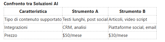 Quando si tratta di scegliere strumenti di intelligenza artificiale, è essenziale confrontare le diverse soluzioni disponibili sul mercato. Fai una lista delle piattaforme che offrono funzionalità che ti interessano e inizia a esaminare le loro offerte. Cosa le distingue? Alcuni strumenti possono eccellere nella generazione di testi creativi, mentre altri potrebbero offrire analisi approfondite. Un buon confronto ti darà una visione chiara delle forze e delle debolezze di ciascun strumento.
