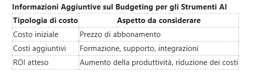 Stabilire un budget appropriato per l'acquisto di strumenti di intelligenza artificiale è cruciale per evitare sorprese finanziarie. Considera non solo il costo iniziale di abbonamento, ma anche eventuali spese nascoste come aggiornamenti, supporto o addestramento. Includere una stima di questi costi nel tuo piano ti permetterà di avere una visione più chiara dell'investimento a lungo termine.