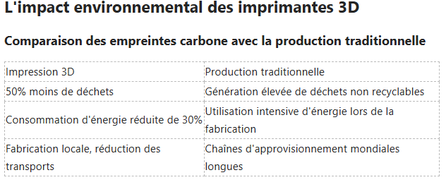 Les imprimantes 3D peuvent contribuer à réduire significativement l'empreinte carbone en minimisant les déchets et en optimisant l'utilisation des ressources. En utilisant des procédés de fabrication additifs, vous créez uniquement ce qui est nécessaire, ainsi les surplus souvent générés par les méthodes traditionnelles. Cette réduction des déchets, combinée à une consommation d'énergie souvent inférieure à celle de la production de masse, fait de l'impression 3D une option attrayante pour un avenir plus durable.