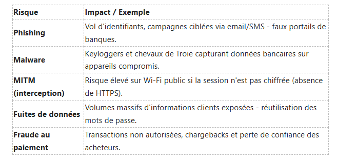 Plusieurs vecteurs menacent directement votre capacité à acheter en toute confiance : phishing, malware, interception de communications, fuites de données et fraude au paiement sont les plus courants. Par exemple, le phishing ciblé peut usurper l'identité d'un site de paiement et capturer vos identifiants, tandis que les fuites massives - comme celle ayant affecté plusieurs centaines de millions de comptes chez de grands acteurs - exposent vos données personnelles et de paiement à la revente sur le dark web.