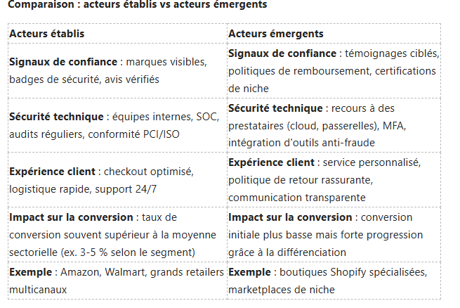 Vous constatez que les acteurs établis disposent généralement d'une longueur d'avance en matière de confiance : marques reconnues, équipes dédiées à la sécurité et certifications visibles (PCI DSS, ISO 27001). Par exemple, les grandes plateformes investissent massivement dans la prévention de la fraude et les programmes de garantie, ce qui réduit l'abandon de panier ; à noter que le taux moyen d'abandon de panier sur le web est d'environ 70 % selon le Baymard Institute, et les sites bien établis peuvent ramener ce taux nettement plus bas via des signaux de confiance clairs.