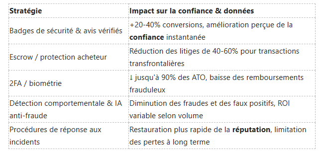 Vous trouverez que les stratégies se répartissent entre celles qui privilégient la confiance perçue (badges, garanties visibles, UX) et celles qui investissent dans la sécurité opérationnelle (chiffrement, authentification, détection). Les meilleures performances naissent quand les deux axes sont combinés.