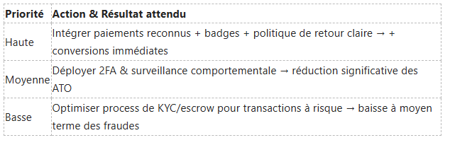 Vous gagnerez en clarté opérationnelle en traduisant ces comparaisons en priorités mesurables : par exemple, ciblez d'abord les actions à fort levier (badges, garanties, paiement reconnu) pour améliorer les conversions, puis investissez progressivement dans des contrôles techniques (2FA, IA) pour sécuriser la croissance et réduire les coûts liés aux incidents.