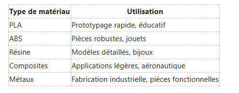R : Les imprimantes 3D professionnelles peuvent utiliser une variété de matériaux, notamment les plastiques (comme l'ABS et le PLA), les métaux (comme l'acier inoxydable et l'aluminium), et les matériaux composites, qui permettent de réaliser des pièces légères mais robustes.