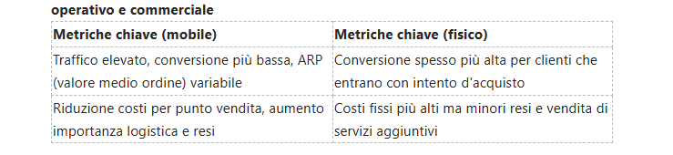 Più nello specifico, quando confronti i canali devi considerare che il mobile eccelle nel ciclo di scoperta e conversione veloce: ricerche istantanee, coupon digitali e pagamenti contactless. Al contrario, il canale fisico mantiene un vantaggio nel ridurre i resi per prodotti che richiedono prova fisica e nel creare fiducia immediata per acquisti di fascia alta.