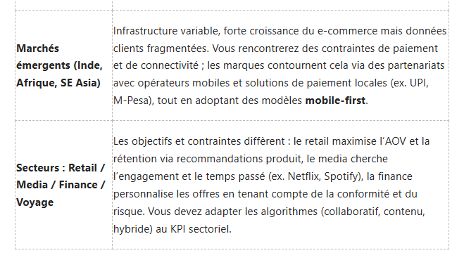 Concrètement, en Inde et en Afrique de l’Est, les solutions vocales, les recommandations par SMS/WhatsApp et les expériences légères en PWA permettent d’atteindre des segments non bancarisés tout en collectant des signaux comportementaux pertinents. Vous devrez souvent prioriser la scalabilité et la faible latence réseau pour que les recommandations restent pertinentes dans un environnement mobile‑first.