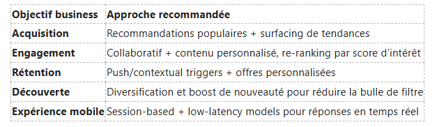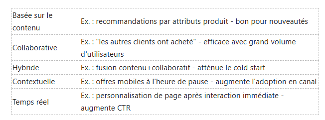 Vous constaterez que chaque type a un objectif : maximiser la pertinence immédiate (CTR), favoriser la découverte (nouveauté) ou augmenter le panier moyen (taux de conversion). En pratique, les systèmes hybrides permettent des gains significatifs sur des KPIs métier tout en atténuant le cold-start.