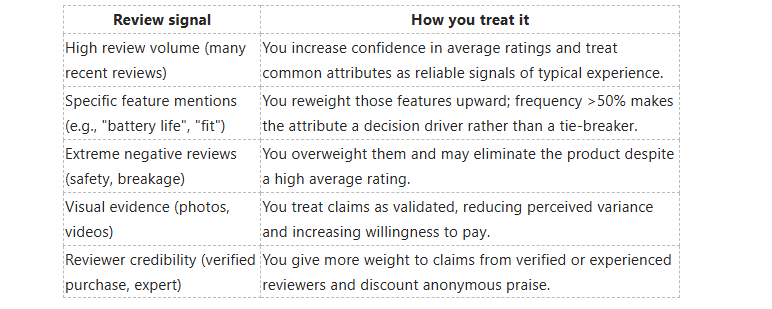 During comparison, you let review content reweight attributes: if most reviewers mention battery life, portability, or customer service, those features become more important in your internal trade-off calculus. You rely on frequency and specificity-statements like “battery lasted 10 hours” or photos of real use push performance attributes higher in your priority list, sometimes outweighing brand reputation or specifications on the product page.