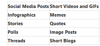 Micro-content refers to small pieces of content that effectively convey a message in a condensed format. This can include anything from short text snippets, memes, GIFs, infographics, to brief videos, all tailored to engage viewers quickly and succinctly. Your goal is to create bite-sized content that captures attention in mere seconds, often fitting within the character limits and time constraints of various social platforms.