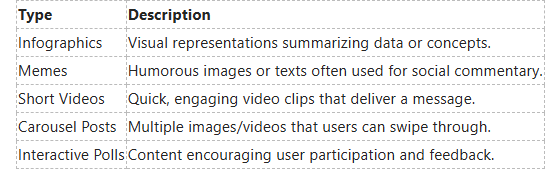 Micro-content comes in several forms, each serving different purposes and engaging users in unique ways. Some common types include infographics, which summarize complex information visually, memes that provide humorous or relatable insight, and short videos that offer quick tutorials or product demonstrations. You also might consider carousel posts and interactive polls to encourage audience participation.
